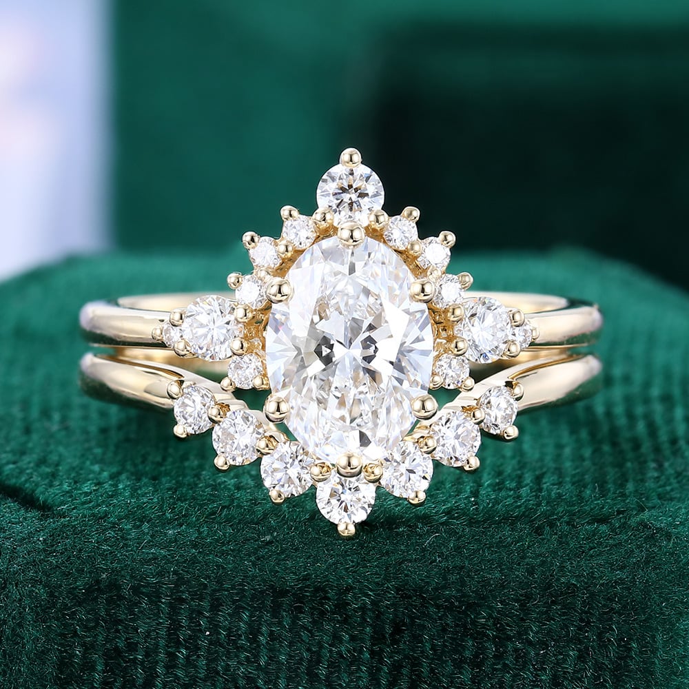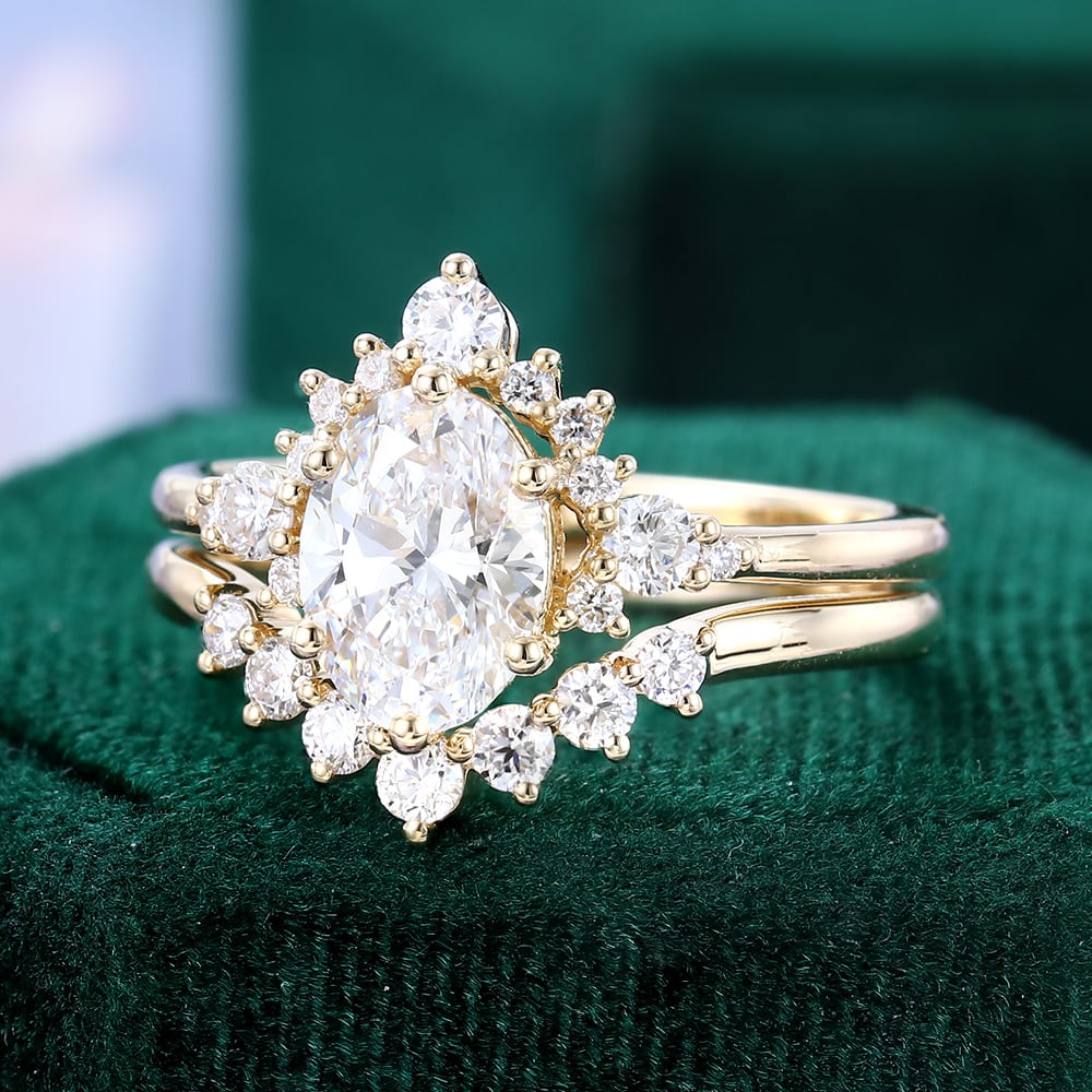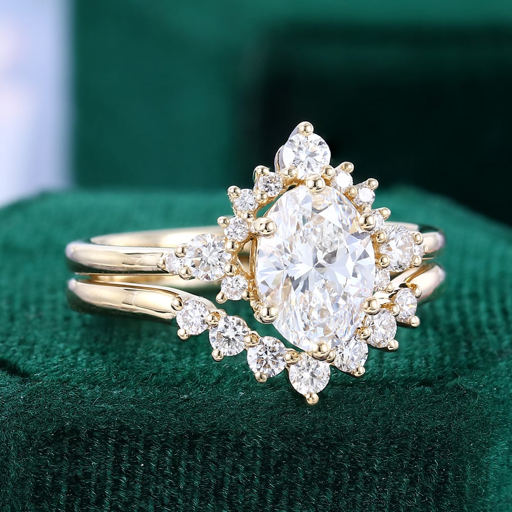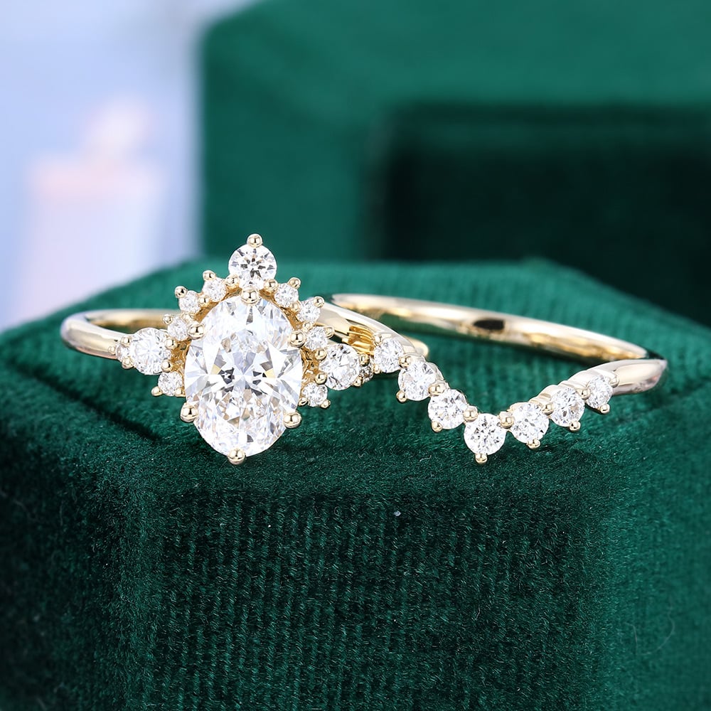 This set features a half-cluster engagement ring paired with a wedding band that has a gentle curve, coming together to form a perfectly matched cluster set, creating a graceful and modern look.