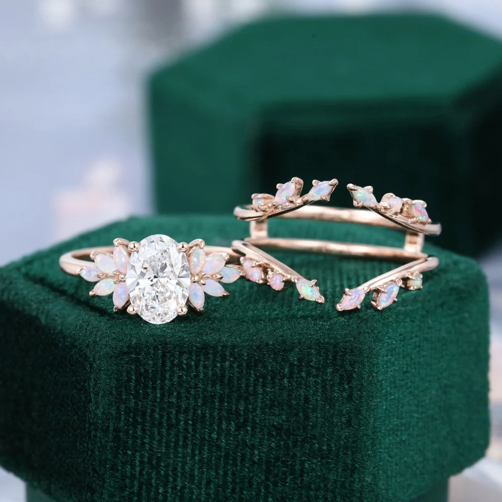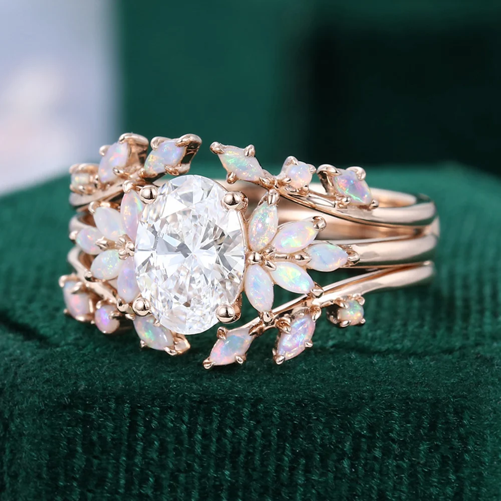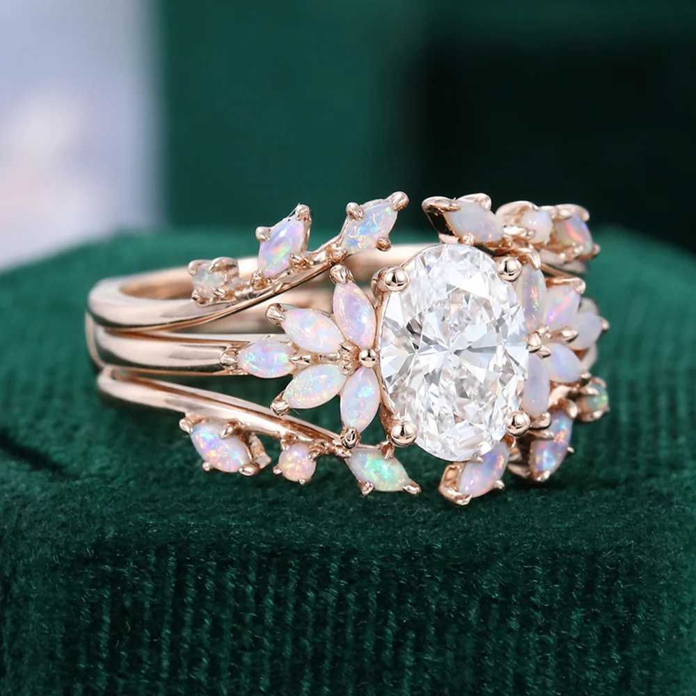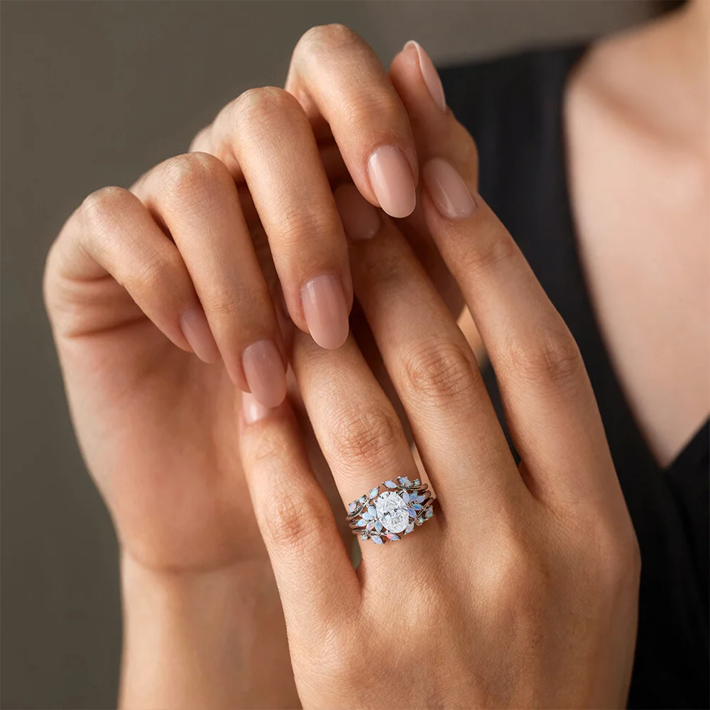 This one-of-a-kind bridal set features a stunning oval cut lab diamond at its heart. Paired with dazzling marquise opals, it creates an effortlessly elegant and undeniably unique look!