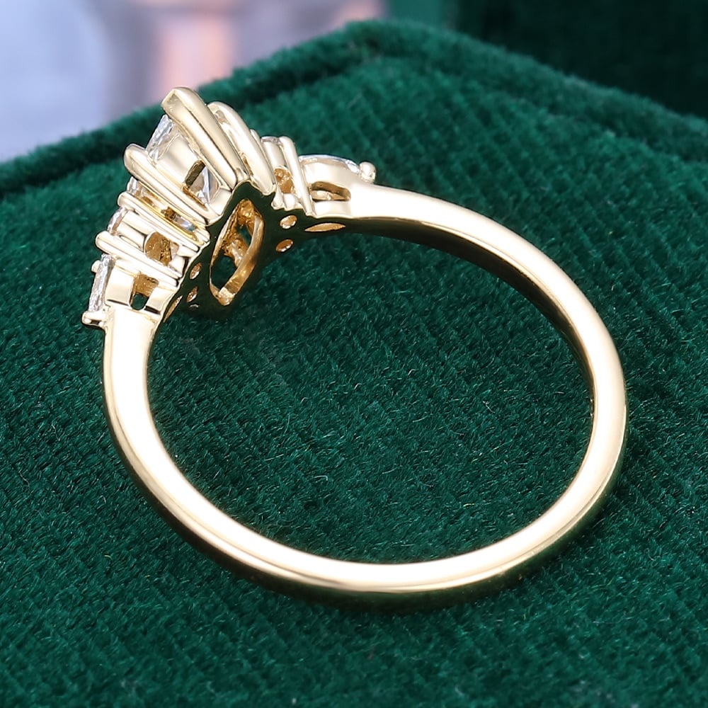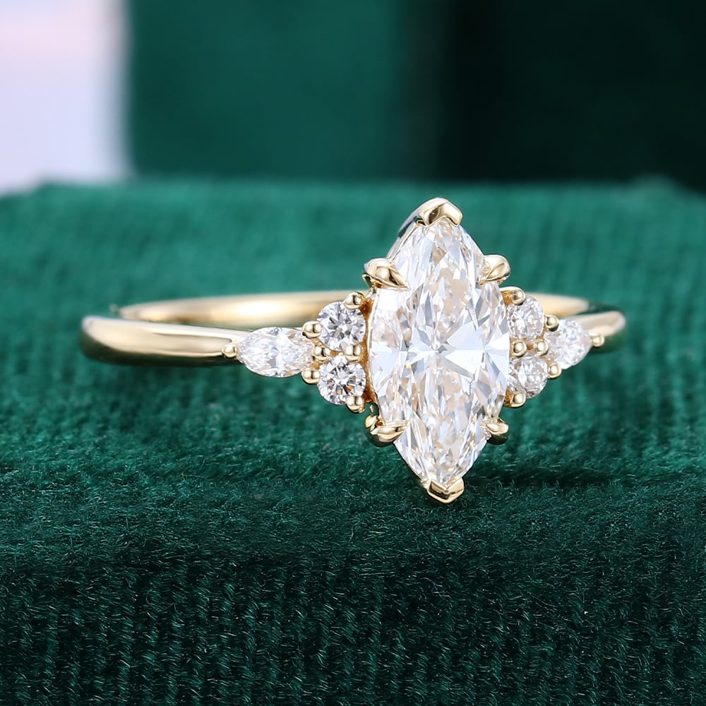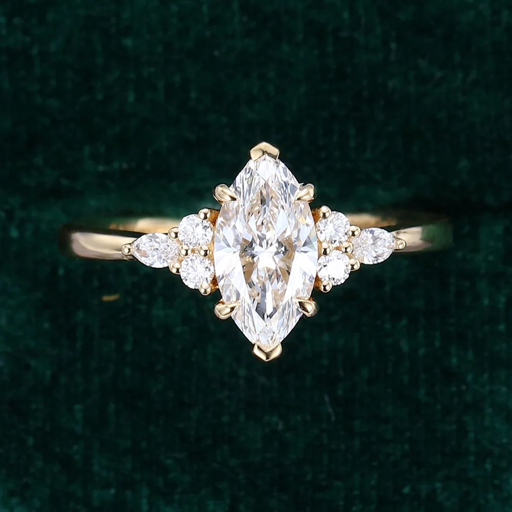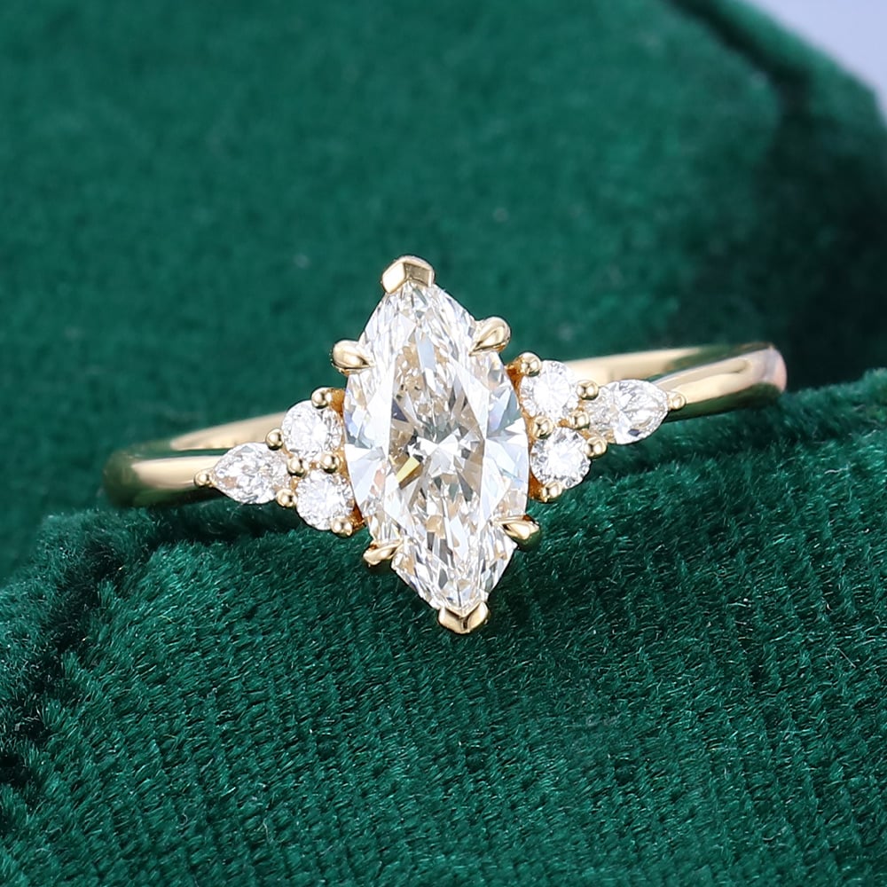 This ring showcases a 1 CT marquise-cut lab diamond, beautifully accented by a cluster of smaller diamonds. Its elegant design makes it a perfect bridal ring, combining timeless beauty with modern sophistication.