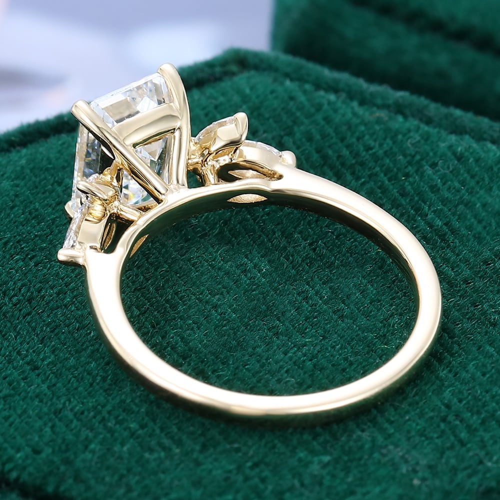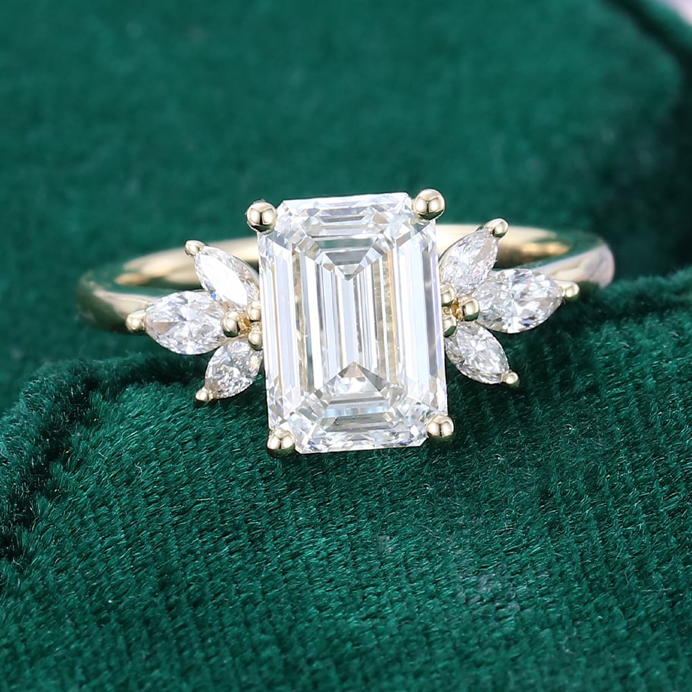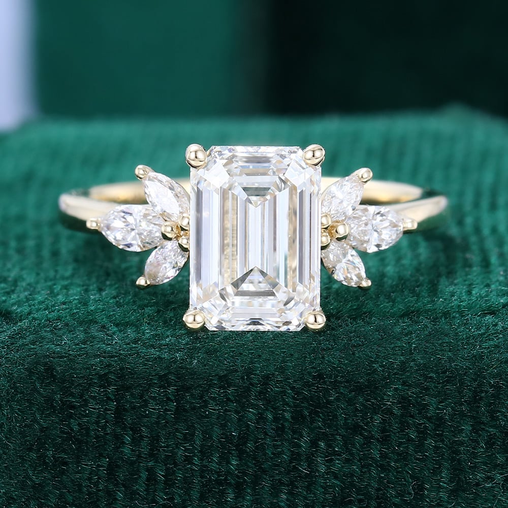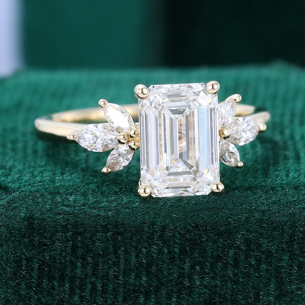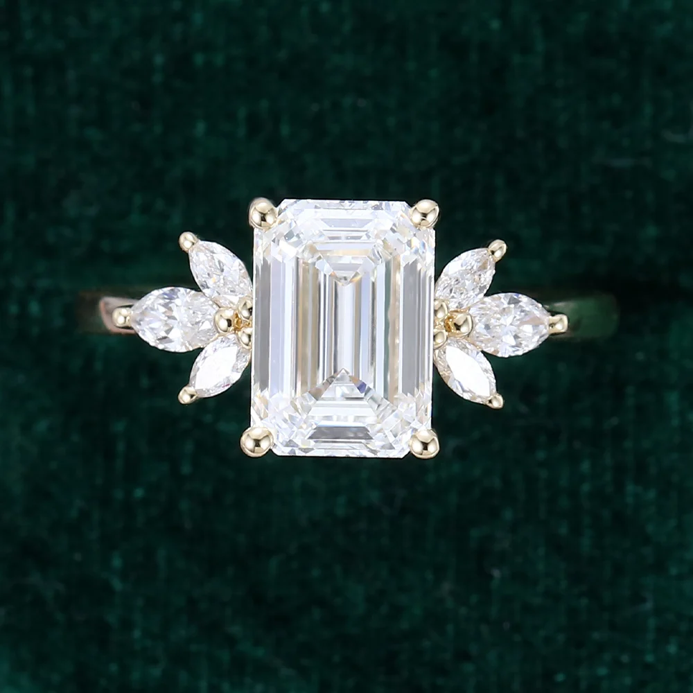 Featuring a stunning emerald cut lab grown diamond as the centerpiece with marquise accents, this piece is a timeless and elegant choice for an engagement or promise ring.