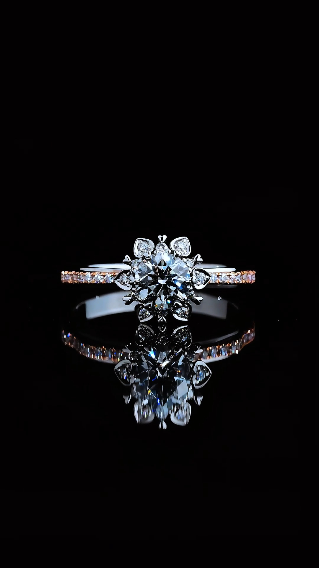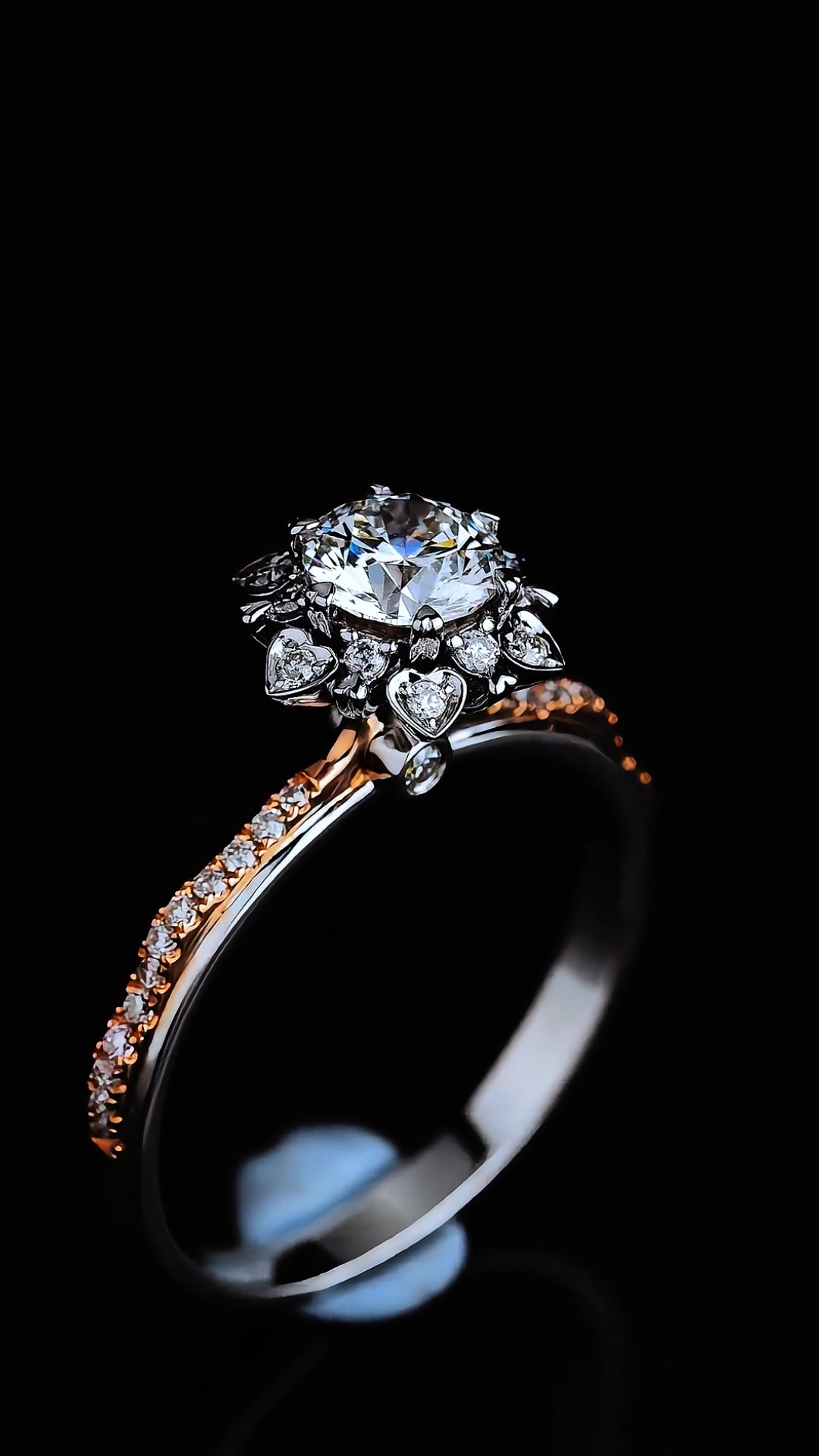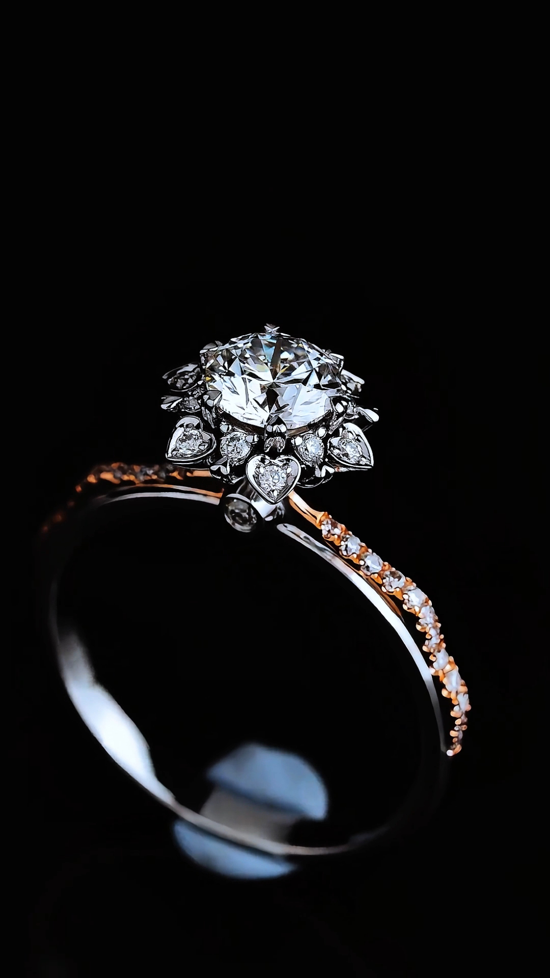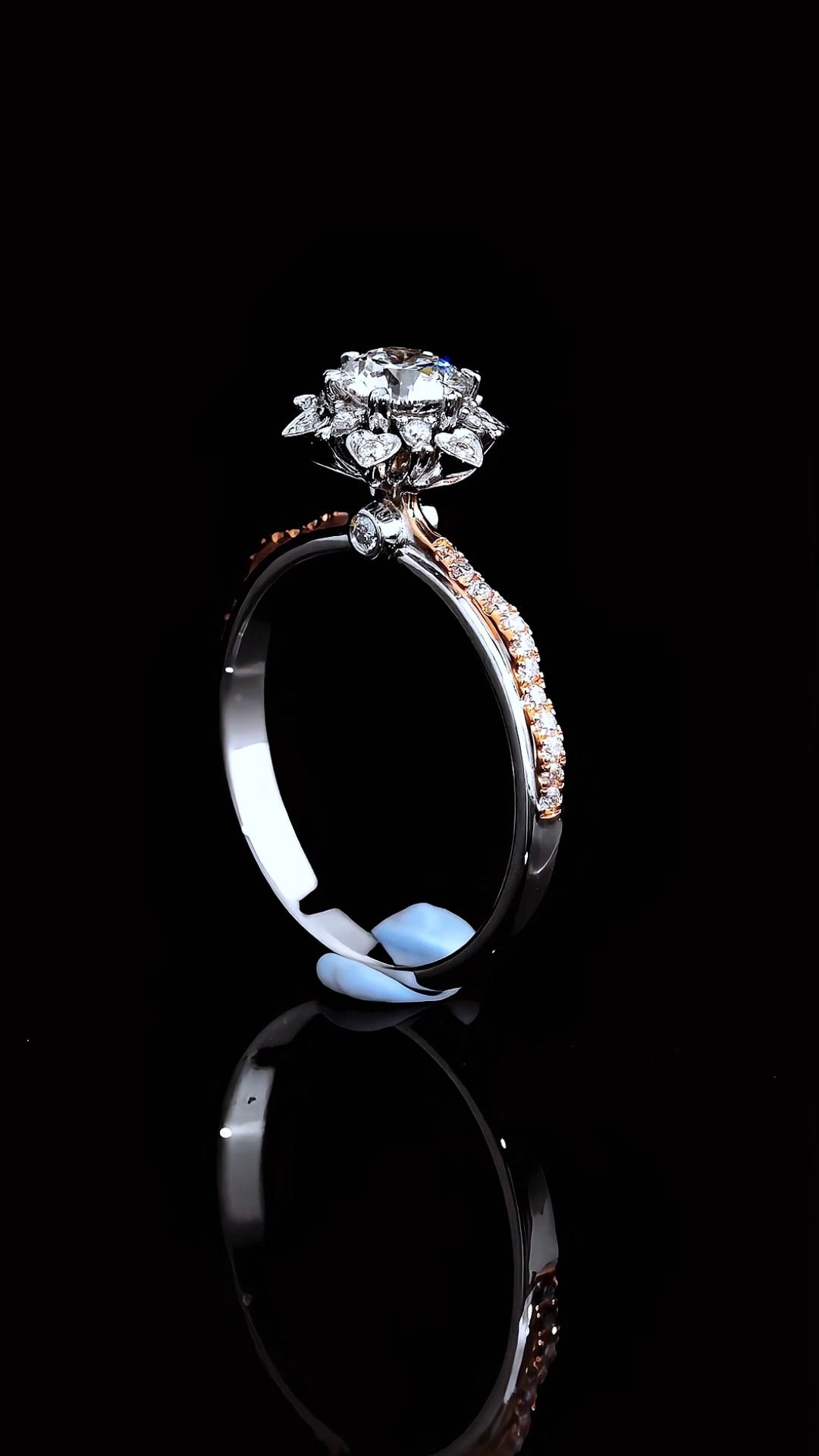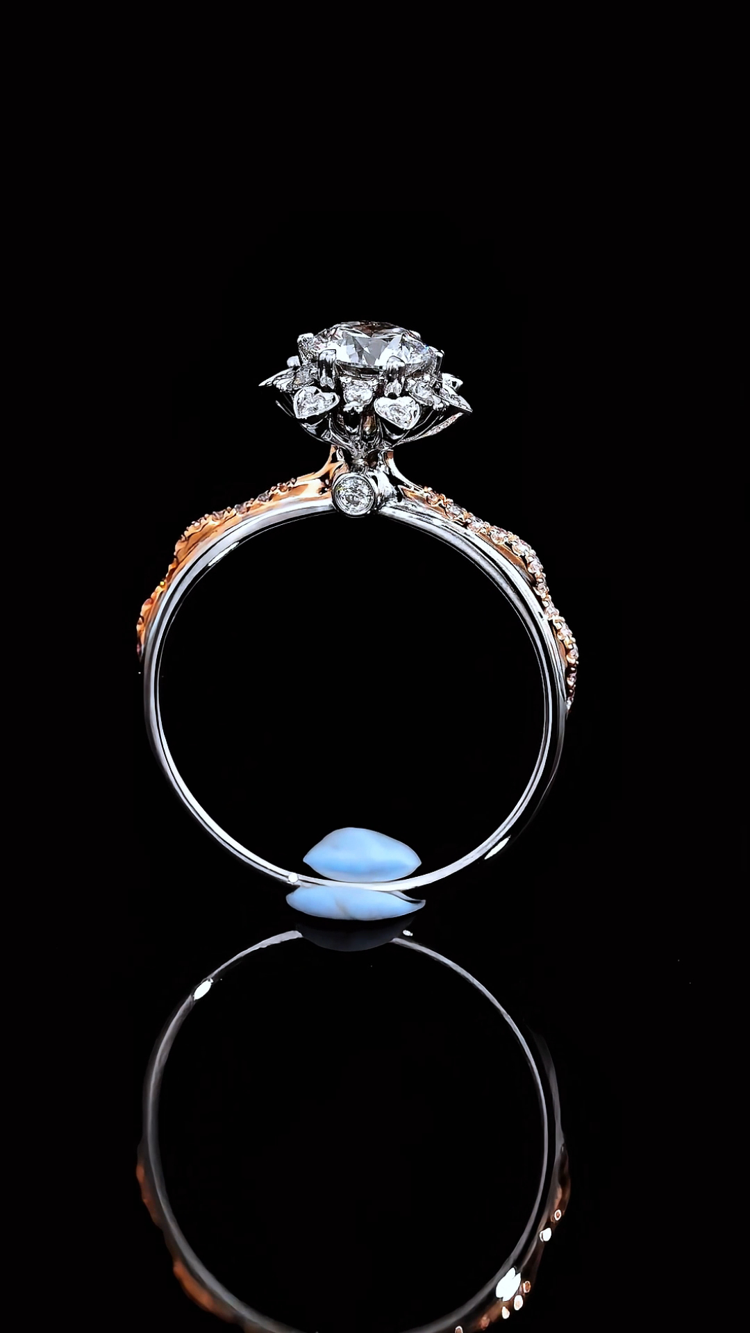 This “Monet’s Floral Language” 18K white gold and 18K rose gold diamond ring symbolizes art, beauty, and eternal love. The central round diamond represents perfection and eternity, while the design inspired by Monet’s garden imparts an aura of elegance and romance. The combination of 18K white gold and 18K rose gold symbolizes the harmonious beauty in love. This ring not only expresses the pursuit of artistic beauty but also embodies the wish for everlasting happiness and romantic love.