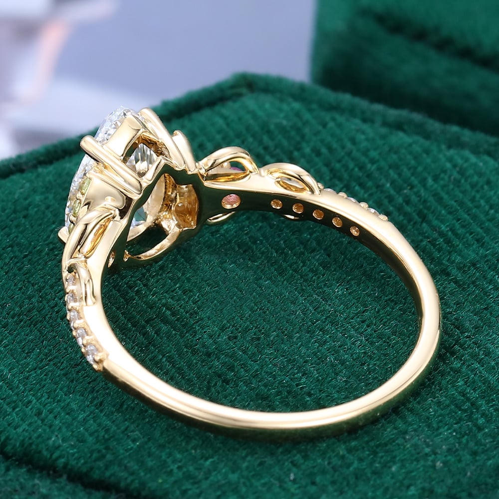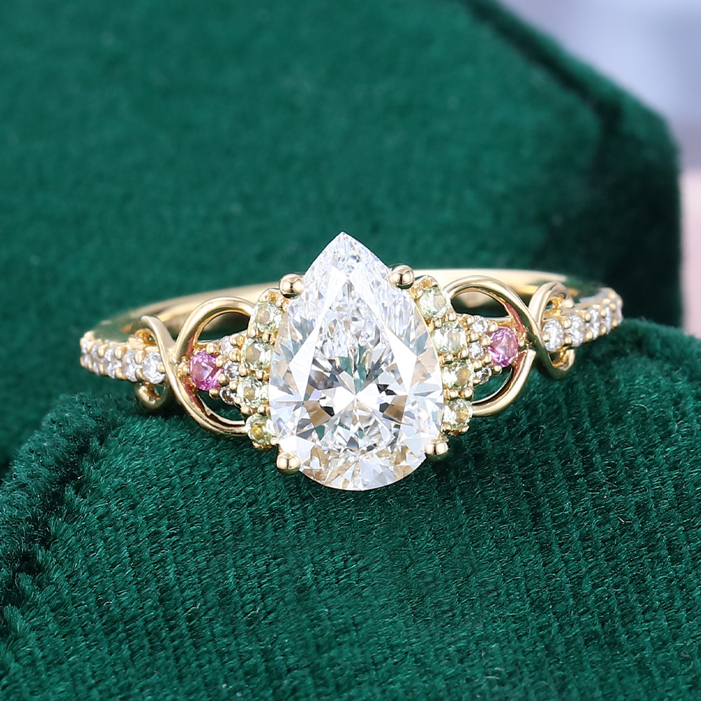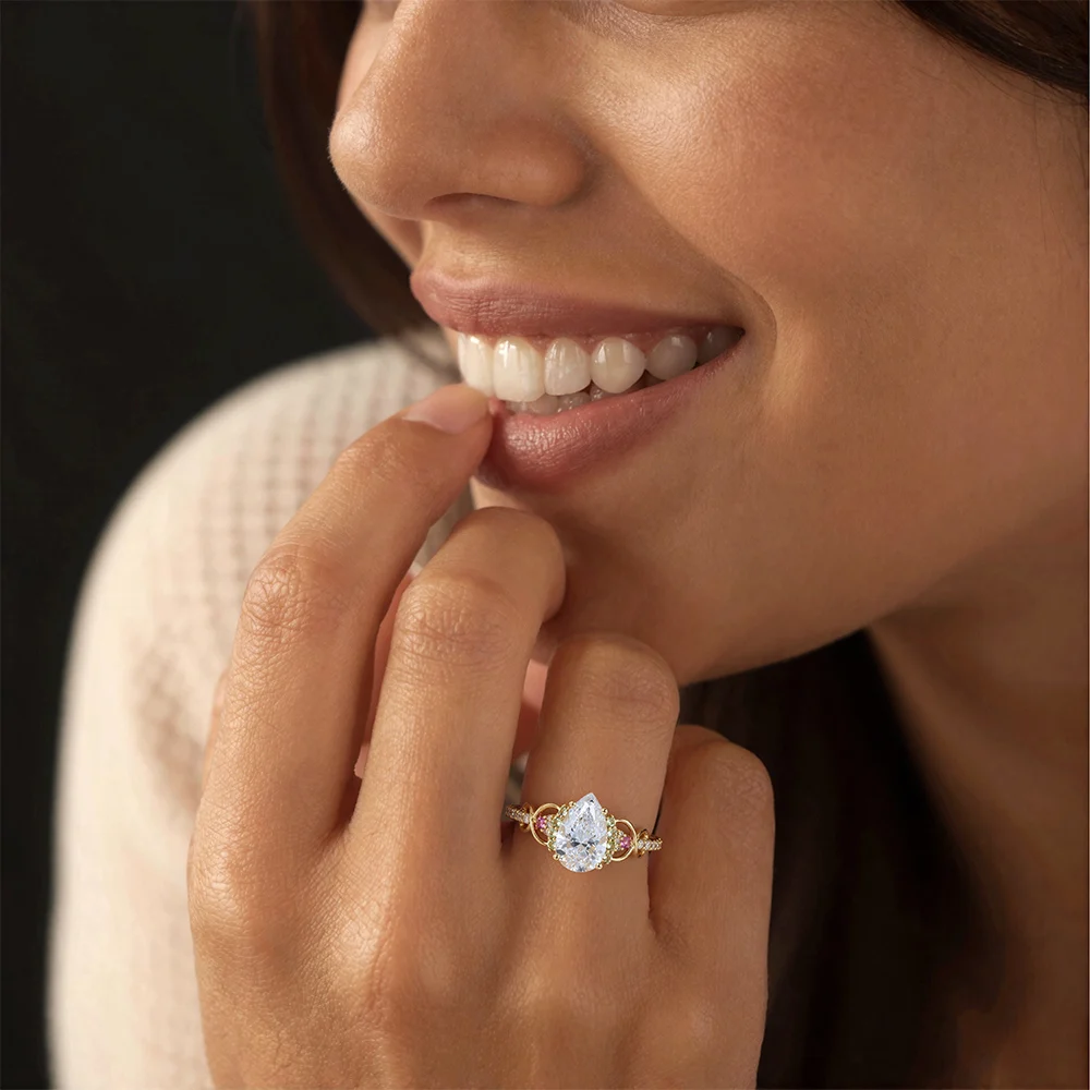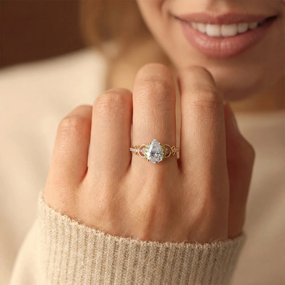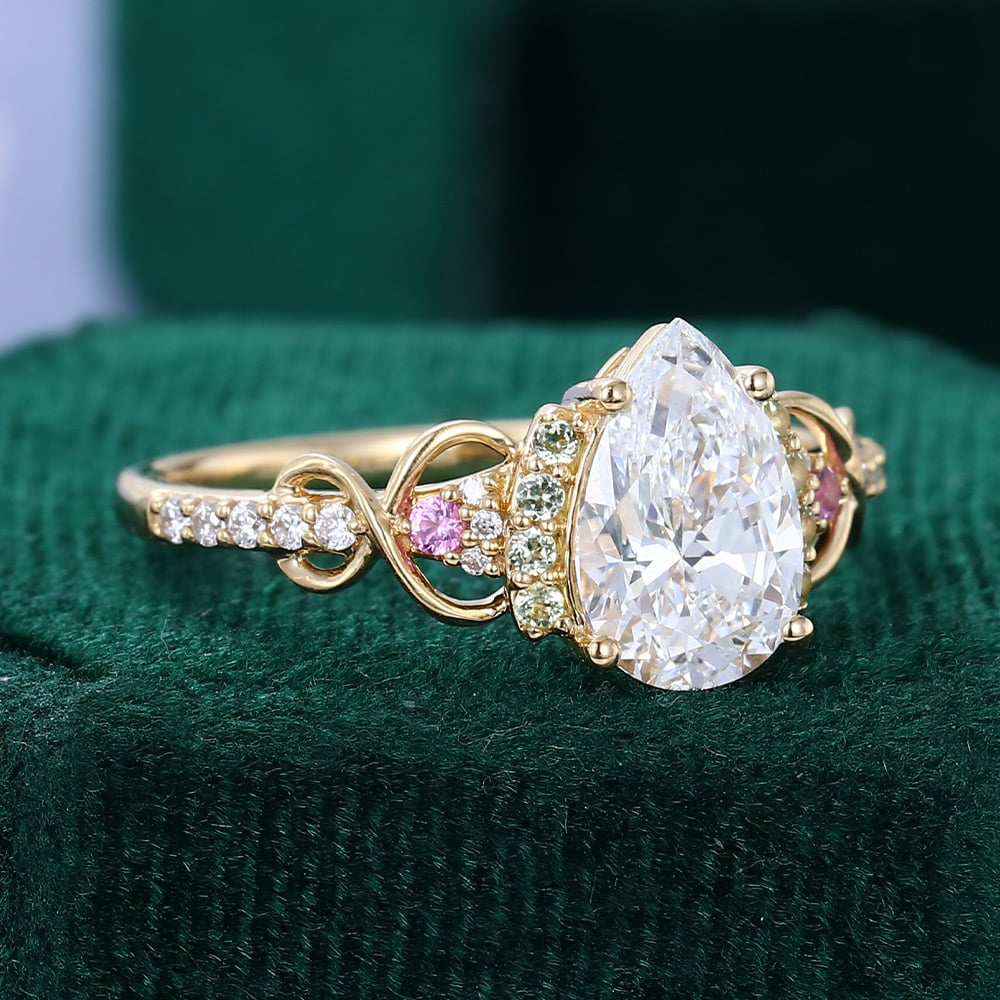 The design features a brilliant pear cut lab diamond center stone, and the intertwined metal lines on the band create an infinity symbol (∞). With every glimmer and curve, this ring beautifully captures the promise of forever in each intricately placed stone.